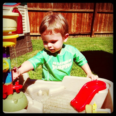 Levi's favorite thing is to go outside. Each night when Matt gets home, it's usually the 1st words out of his mouth - 'OUTSIDE!' complete with arm pump in the air. I think he'd live out there if we could figure out a way to make it happen. We got to spend some quality outside time with friends earlier in the week. He wasn't too keen on the pool at Sam's house, but he did have fun with the water table & the eating of the popsicles! Thanks for the kid time & delicious treats S&S! Now here's to long summertime naps.